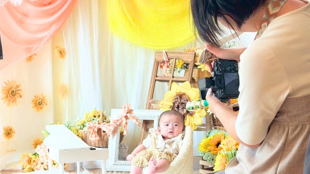 とびきり可愛いひまわり柄のフォトスタジオに早変わり。