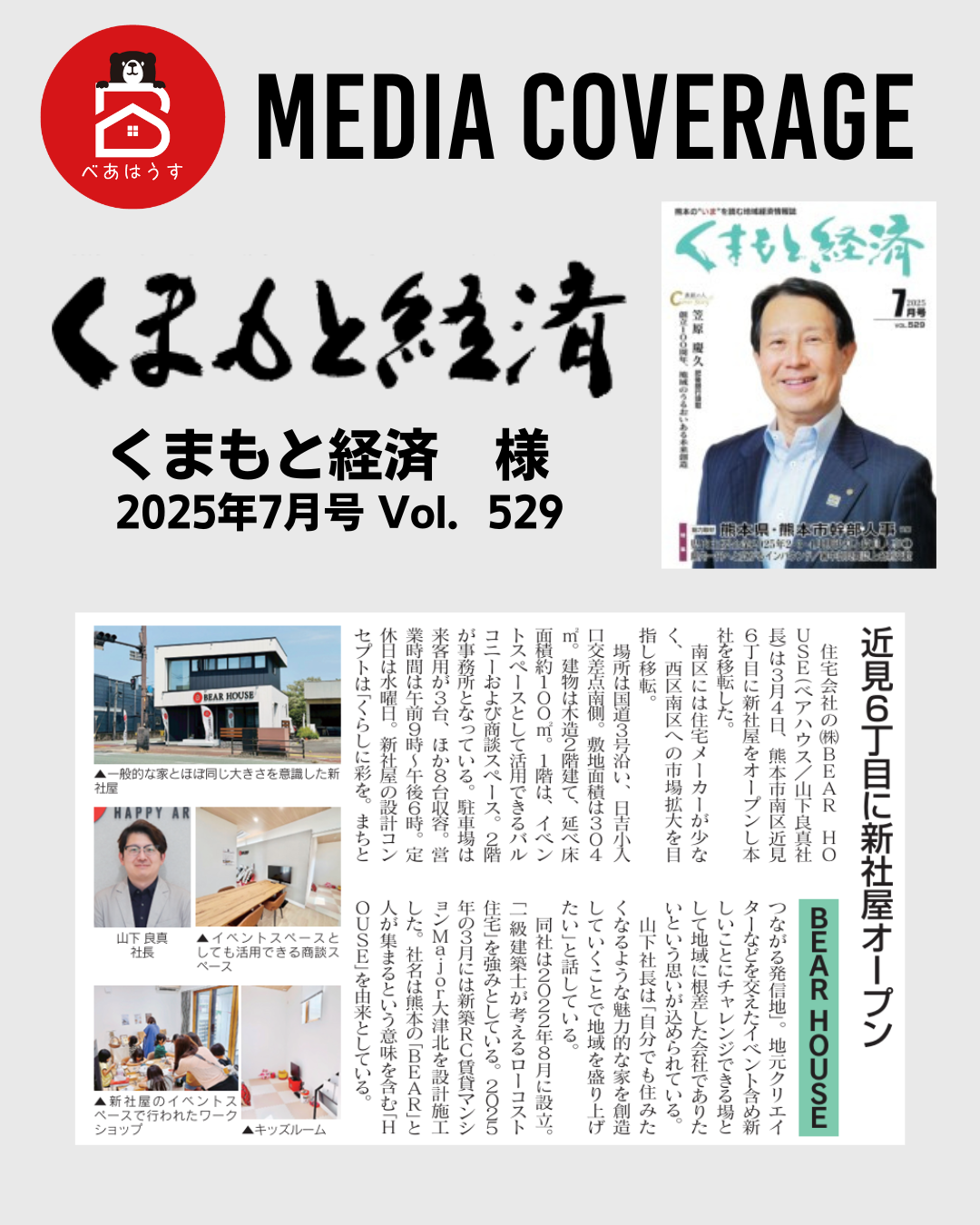 このたび、BEAR HOUSEの新事務所オープンに関するニュースおよび取り組みを、熊本の地域経済誌『くまもと経済 7月号』にご掲載いただきました。