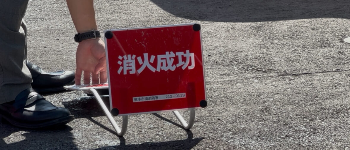 熊本市消防局より消防士の皆さんをお招きし、避難訓練を実施しました。実際に避難通報を行い、消防士の方々からの指導を受けながら、訓練用消火器を使った初期消火訓練も行いました。
