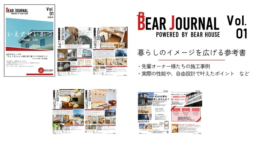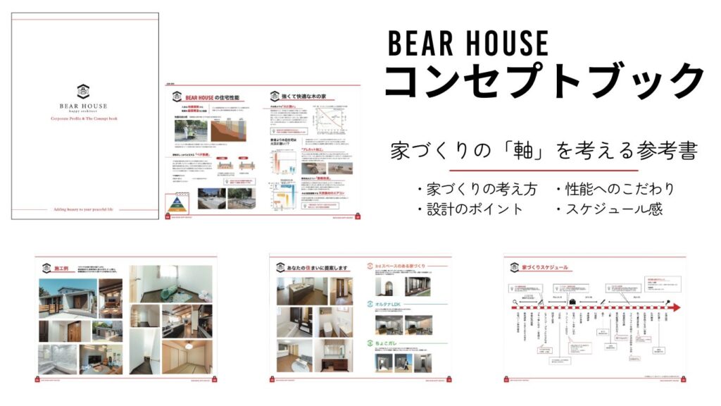 家づくりの「軸」と、暮らしの「イメージ」。 その両方がわかる、BEAR HOUSEオリジナルの住まいづくりの参考書です。 これから熊本で家づくりを始める方へ、無料でご自宅にお届けします。