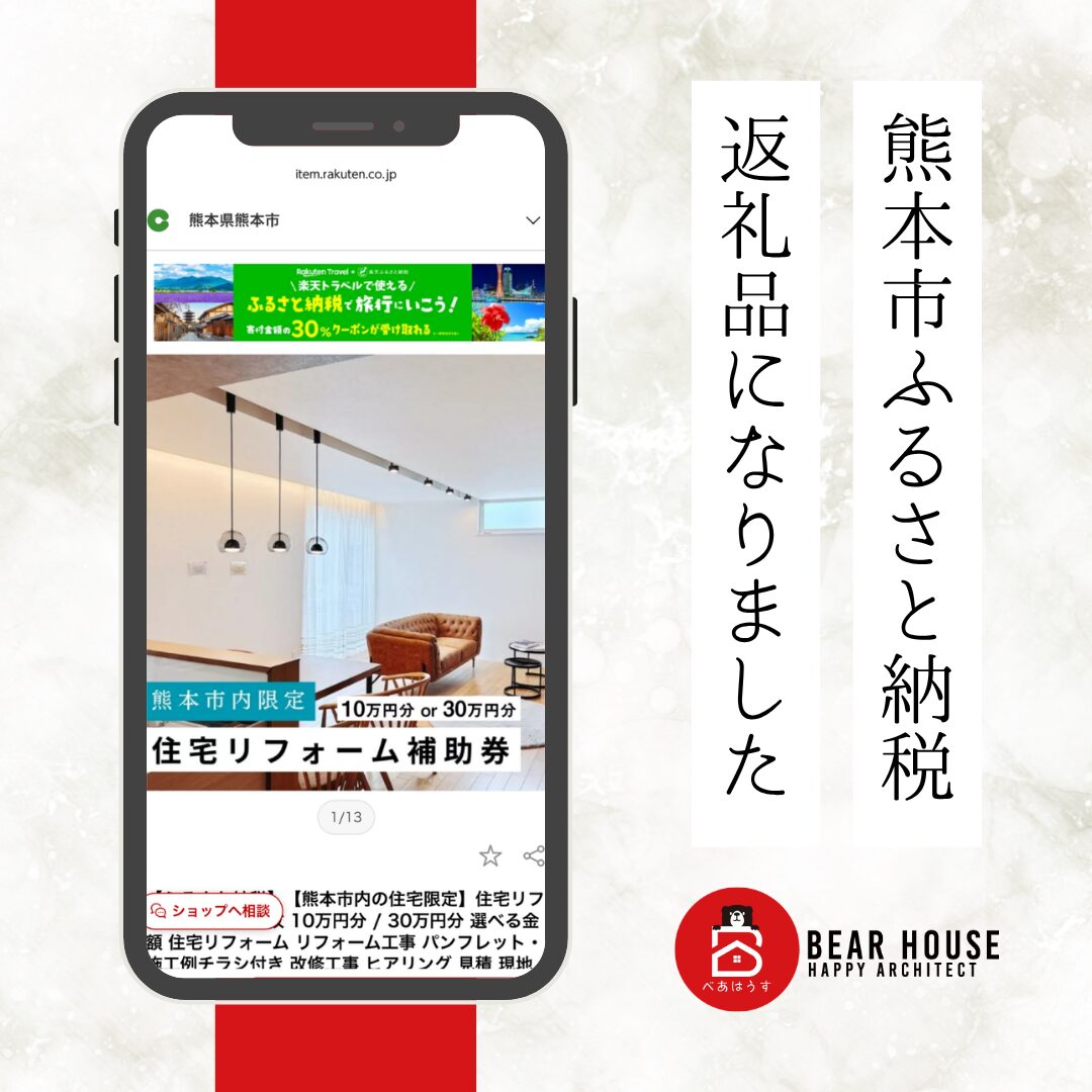 BEAR HOUSEのサービスが熊本市ふるさと納税の返礼品になりました! この度、熊本市内の住宅限定で施工が可能な、BEAR HOUSEのリフォーム補助券が熊本市ふるさと応援寄附金(ふるさと納税)のお礼の品として掲載されました! 熊本市内の方は熊本市にふるさと納税ができませんので、ご実家などが熊本市にあり、かつ、修繕改修や間取りの変更など、現在のお宅でのお困りごとを解決するためにご利用いただけるチケットです。それぞれ、10万円・30万円の工賃に充当していただける補助券となっており、ふるさと熊本市への寄附に加え、想いの詰まったふるさとご実家への心を込めた贈り物としてもお使いいただけたらと思っています。 詳しくは、各ふるさと納税ポータルサイトよりご覧ください。 ふるさとチョイス https://www.furusato-tax.jp/product/detail/43100/6984334 https://www.furusato-tax.jp/product/detail/43100/6984335 楽天ふるさと納税 https://item.rakuten.co.jp/f431001-kumamoto/343-1967 ふるなび https://furunavi.jp/product_detail.aspx?pid=1890797 https://furunavi.jp/product_detail.aspx?pid=1890796 au PAY ふるさと納税 https://furusato.wowma.jp/products/detail.php?product_id=2546459&product_div=bel https://furusato.wowma.jp/products/detail.php?product_id=2546460&product_div=bel (ご紹介したのはほんの一部です。お使いのふるさと納税サイトで「熊本市 BEAR HOUSE」などとご検索ください!)